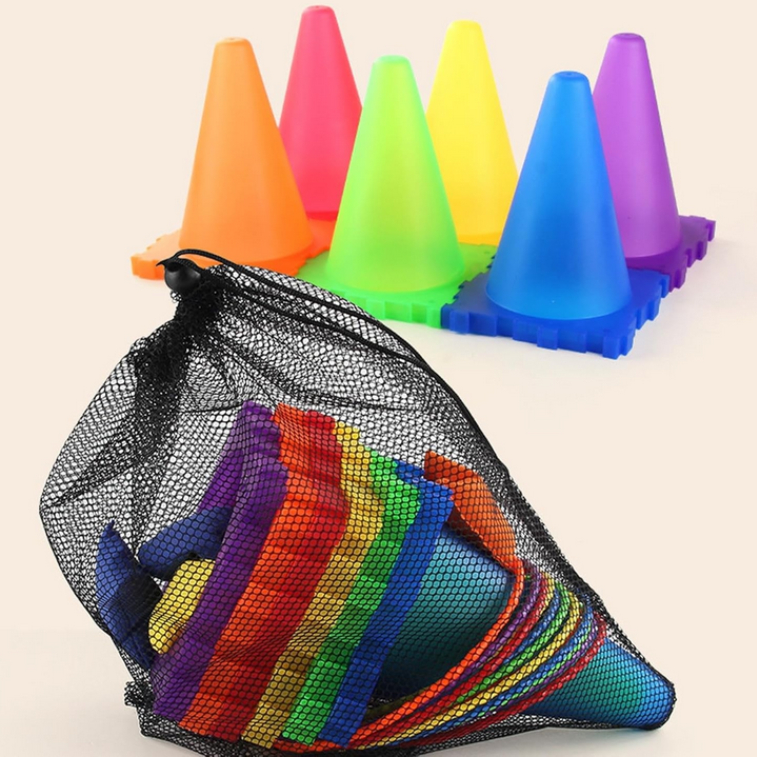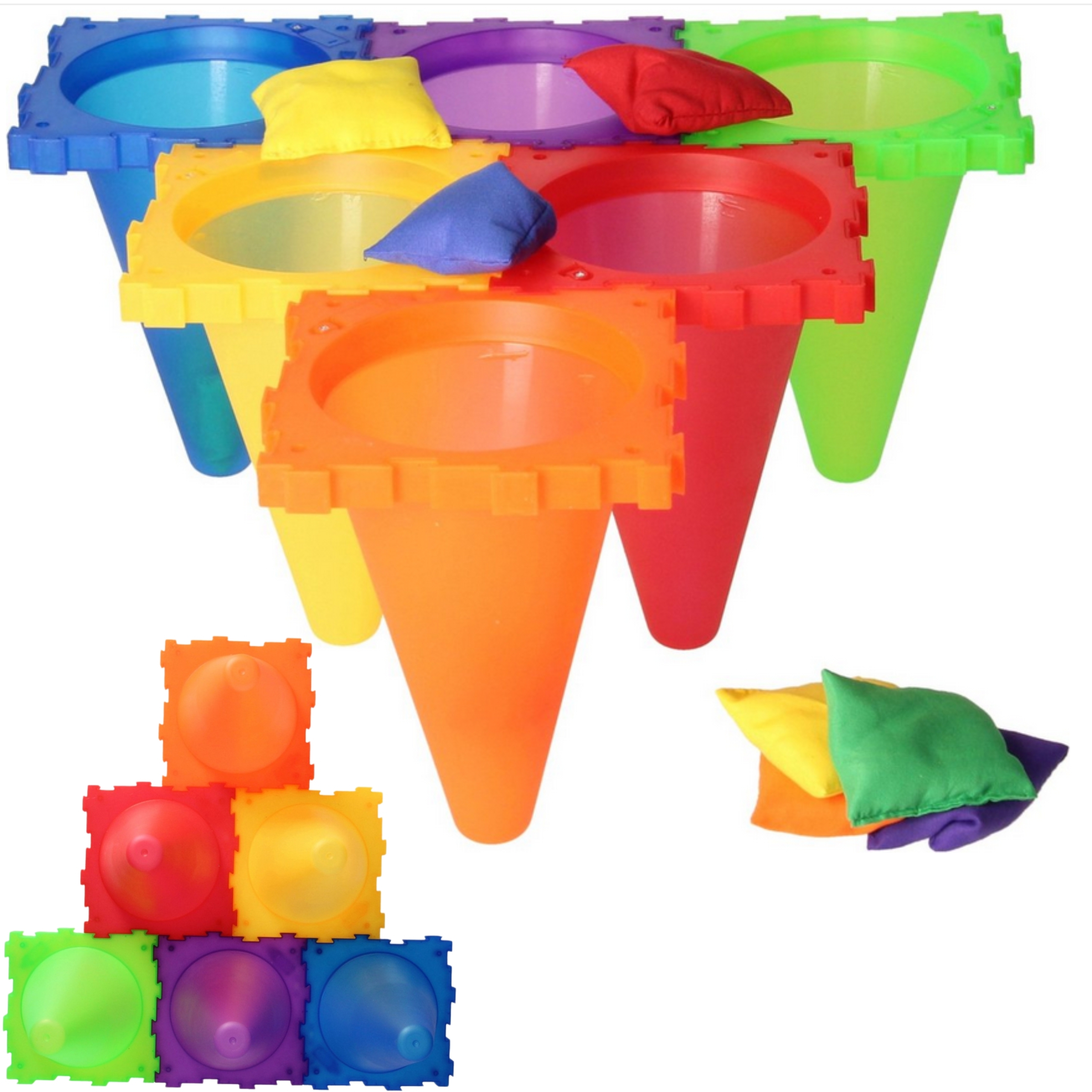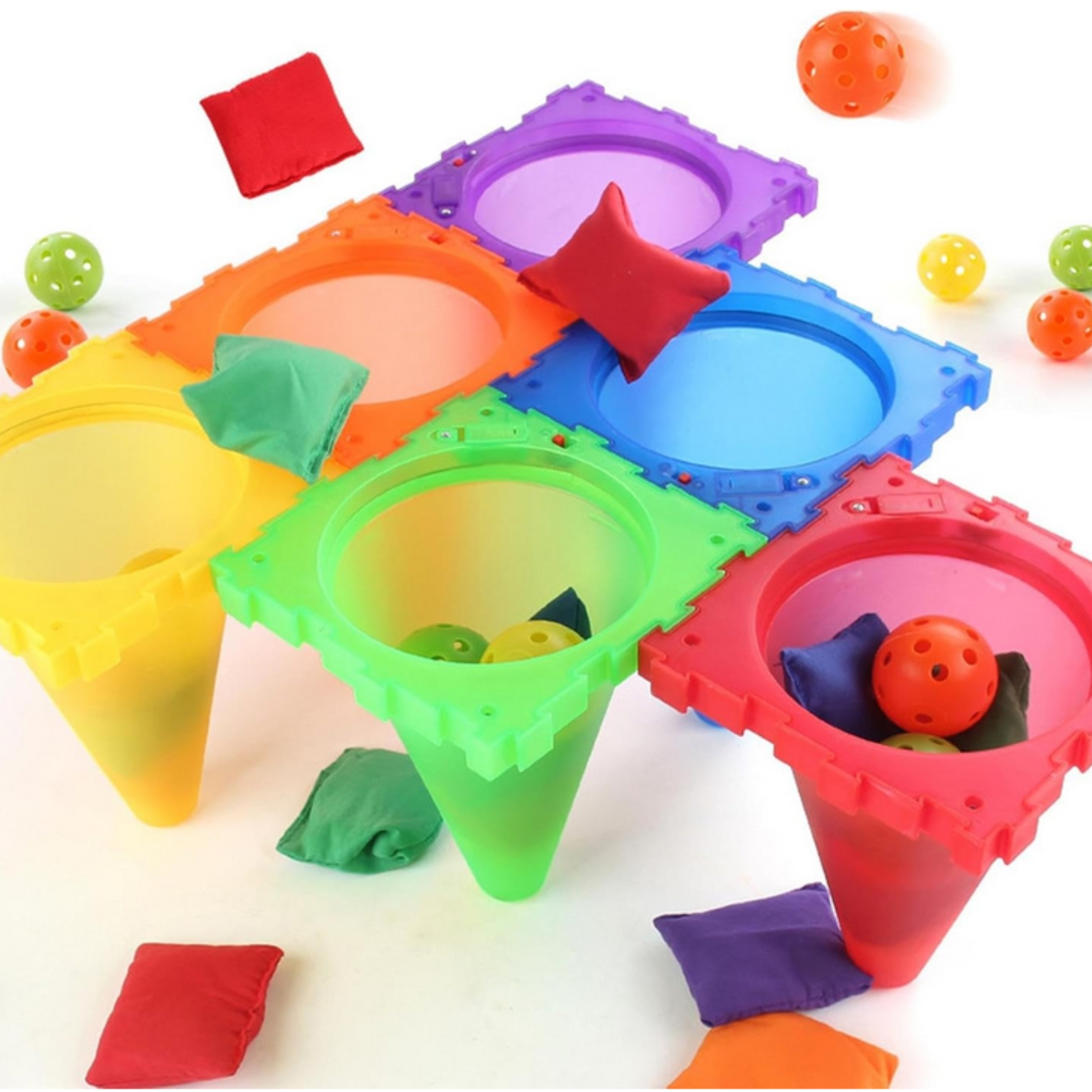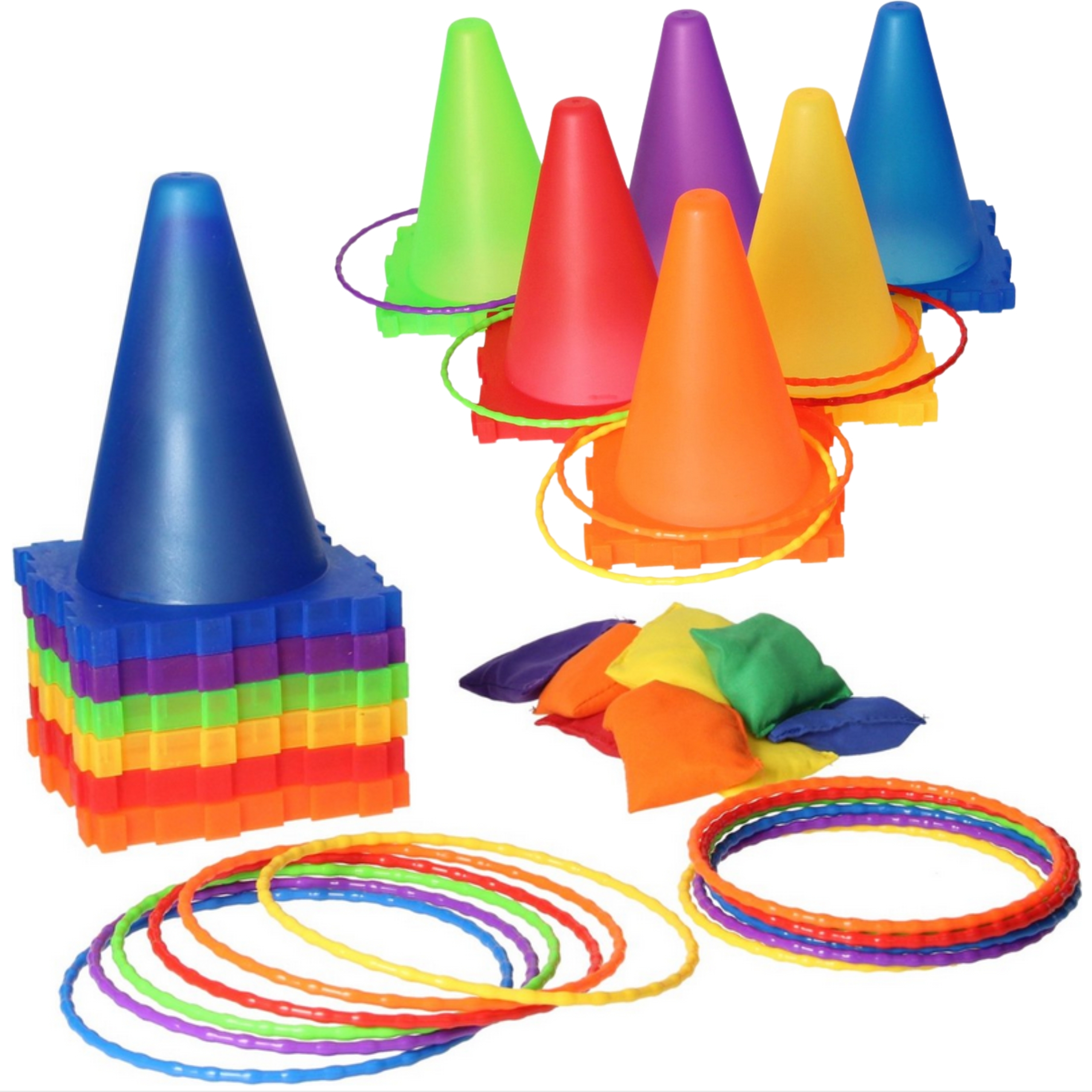 - Žiedų mėtymo žaidimas: populiarus žaidimas, kuriame reikia užmesti žiedus ant spalvingų kūgių. Padeda lavinti atstumo pojūtį ir tikslumą.