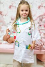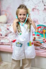 - Erdvios kišenės: Patogus dizainas su kišenėmis, kuriose vaikai gali laikyti mažus gydytojo įrankius ar žaislus.