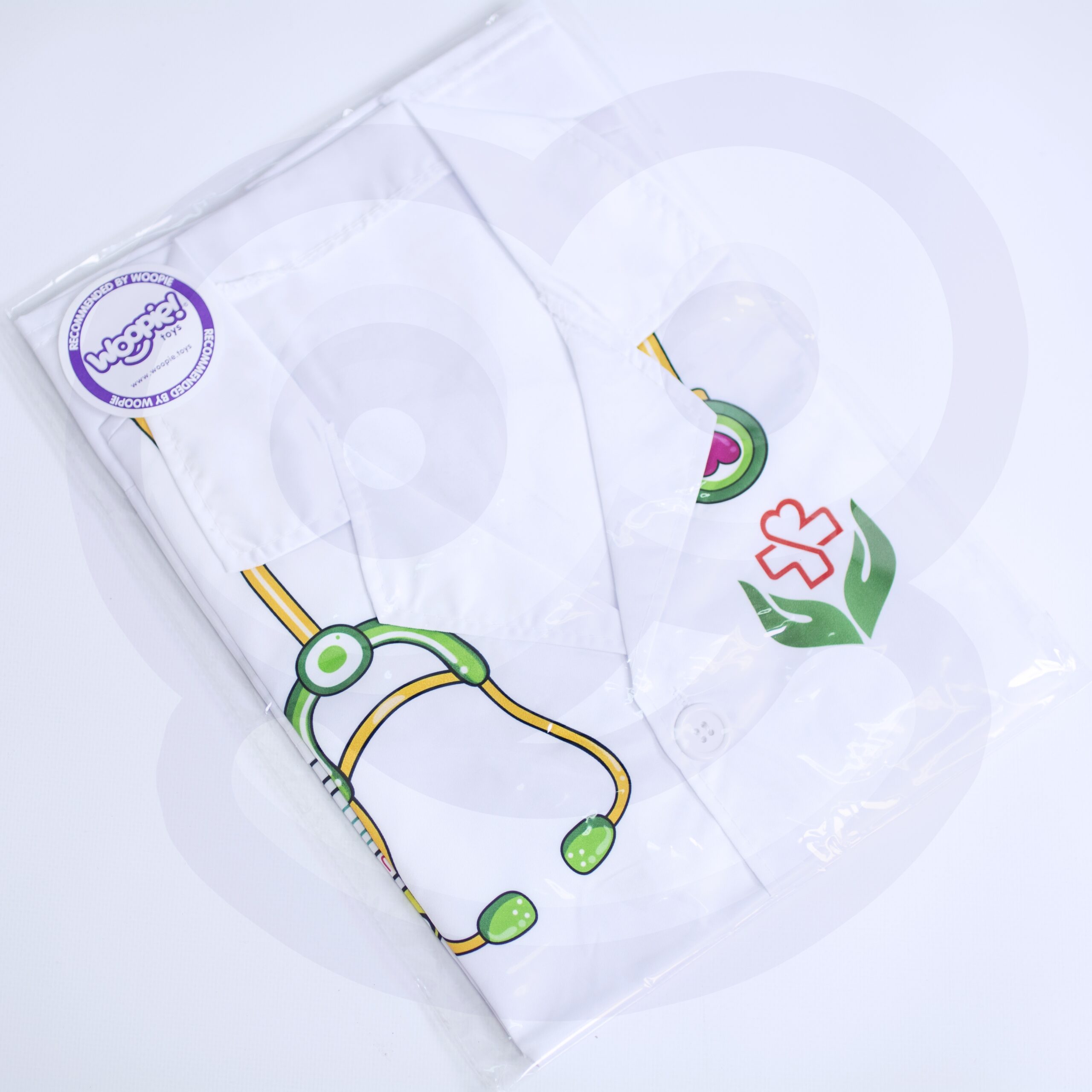 - Spaudiniai: Kostiumas turi atspaudus, imituojančius stetoskopą, sąsiuvinį, vaistus ir termometrą, todėl jis dar labiau primena tikro gydytojo uniformą.
