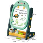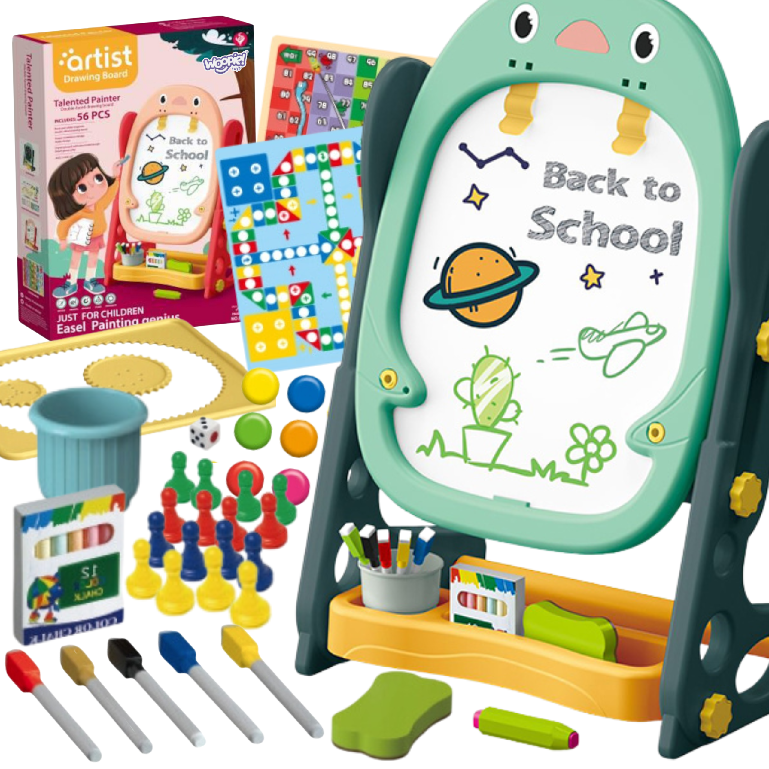 • Pilnas priedų komplektas: Komplekte rasite kreideles, flomasterius, magnetines raides ir skaičius, 2 stalo žaidimus, kempinę lentos valymui, lentynėlę daiktams laikyti ir puodelį flomasteriams, suteikiantį tvarkos ir patogumo.