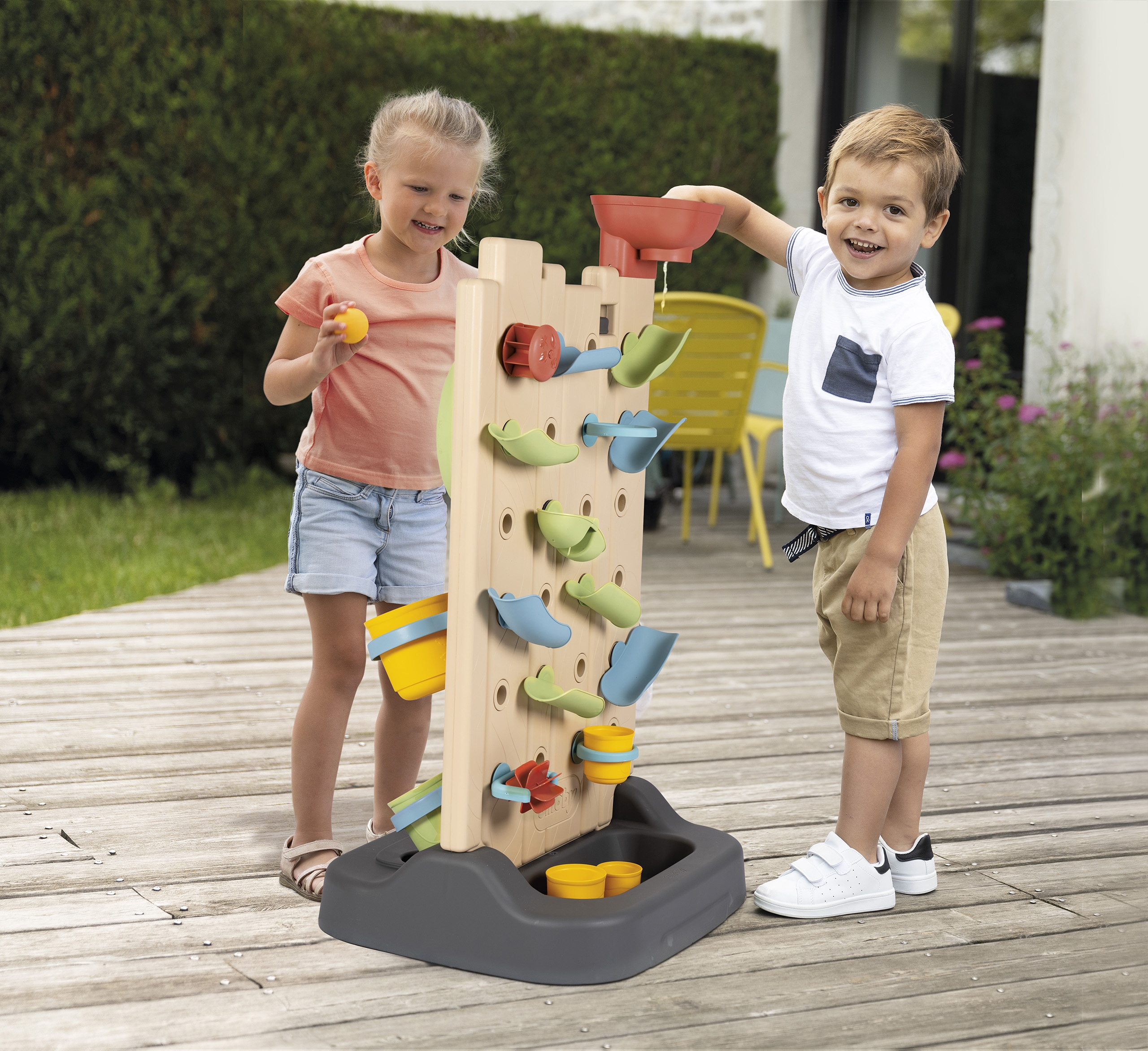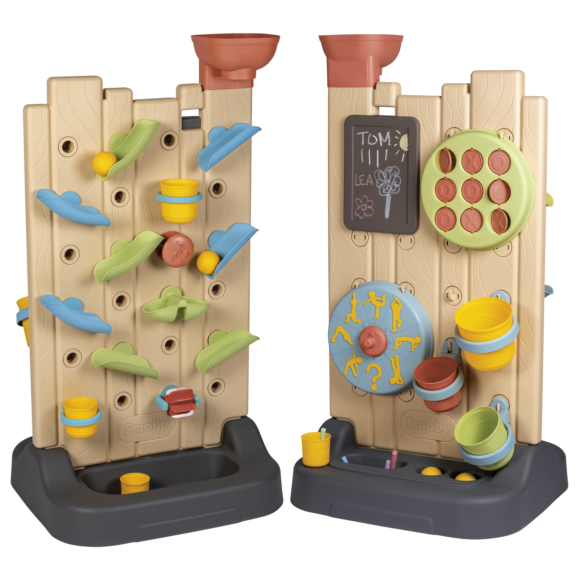 - Daug veiklos: Net 6 skirtingos veiklos (vandens žaidimai, tic-tac-toe žaidimas, kreidos lenta, sporto ratas, kamuoliukų mėtymo žaidimas ir interaktyvūs elementai vandens kelių kūrimui) suteiks vaikui begalę pramogų ir galimybių tyrinėti.