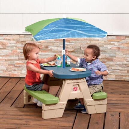 Šis šešiems vaikams skirtas iškylų stalas su dviem patogiais suolais ir specialiai suformuotomis sėdynėmis yra puikus pasirinkimas žaidimams tiek lauke, tiek sode. Pagamintas iš masyvaus plastiko su dvigubomis sienelėmis, kurios yra užpildytos oru, stalas pasižymi ypatingu tvirtumu ir ilgaamžiškumu. Elementų storis, siekiantis 5–6 cm, suteikia stalui stabilumo ir leidžia jį naudoti ilgą laiką. Stalo viršus yra itin didelis (virš 100 cm ilgio ir 50 cm pločio), tad jis suteikia pakankamai erdvės įvairioms veikloms. Be to, pridėtas skėtis apsaugo vaikus nuo UV spindulių, užtikrinant jų saugumą žaidžiant saulėtą dieną.