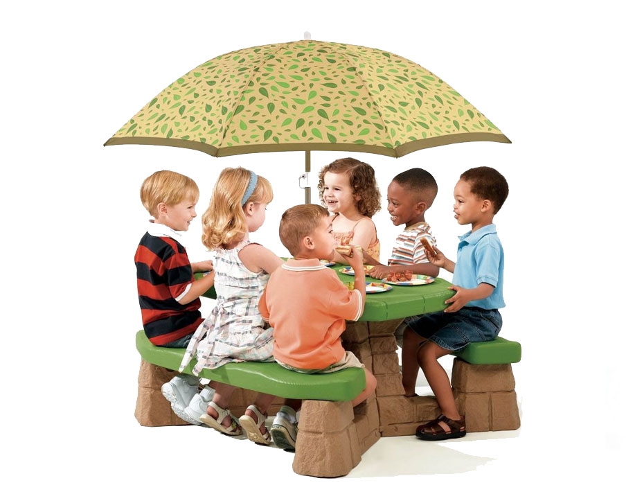 Pridedamas skėtis apsaugo vaikus nuo kenksmingų UV spindulių, todėl jie gali saugiai žaisti net saulėtą dieną. Stalas lengvai valomas ir atsparus įvairioms oro sąlygoms, tad jį galima naudoti bet kokiame lauko erdvėje.