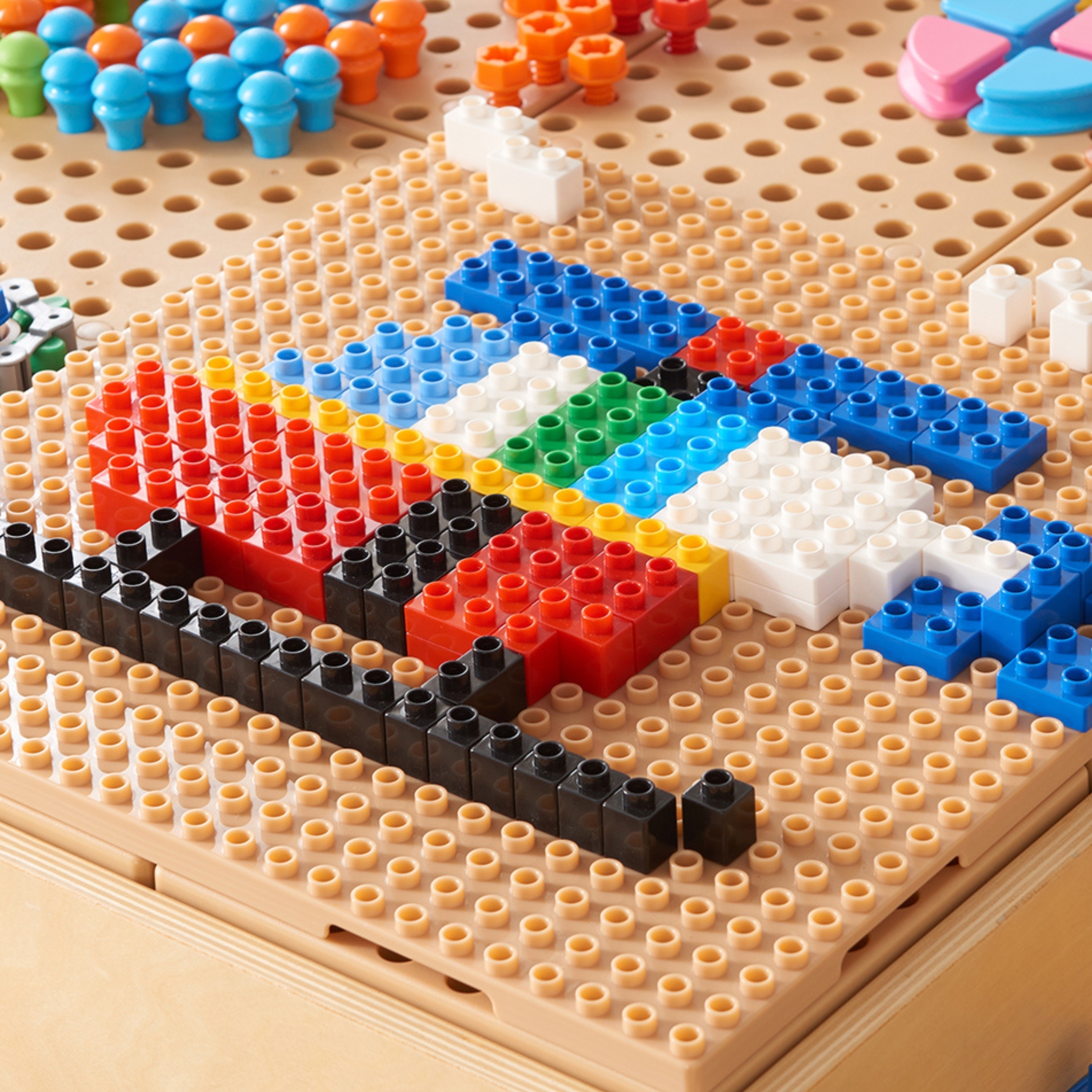 - Specialus pagrindo plokštelių dizainas su iškiliomis jungtimis užtikrina lengvą ir patikimą kaladėlių tvirtinimą, leisdamas vaikams statyti aukštus ir sudėtingus statinius be jokių apribojimų.