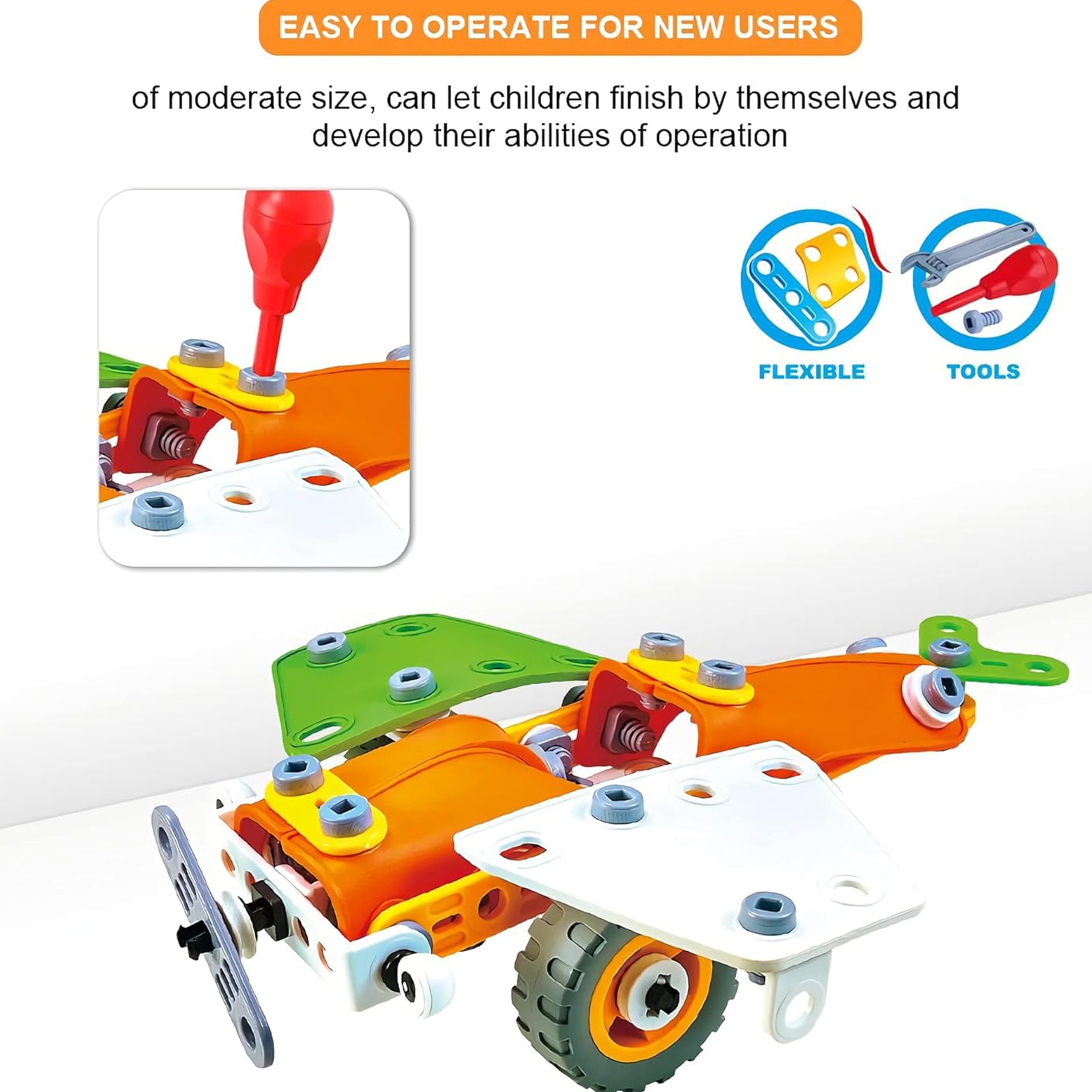 • 5 skirtingi modeliai: iš lanksčių elementų galima sukurti automobilį, keturratį, malūnsparnį, lėktuvą ir robotą!
