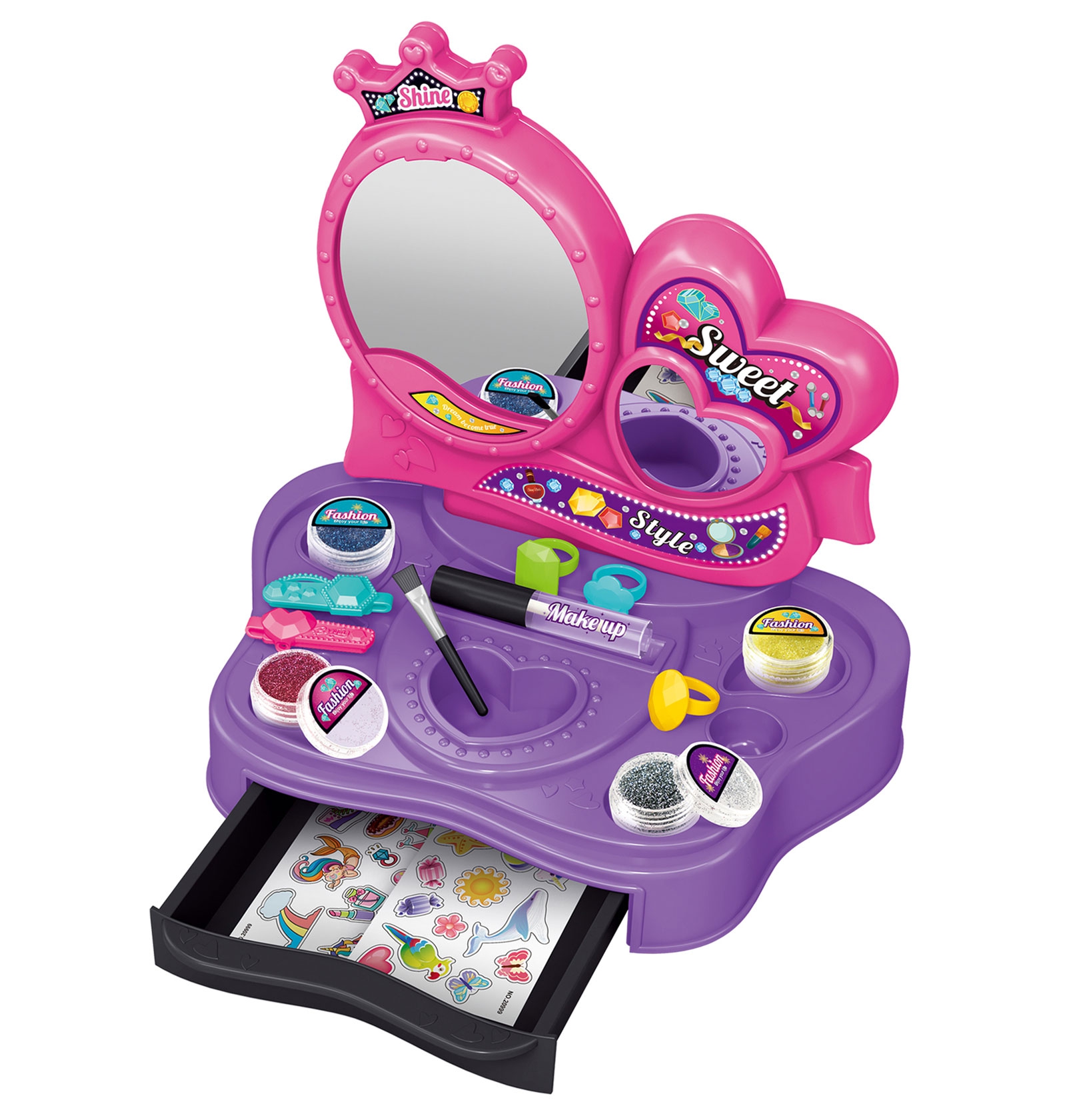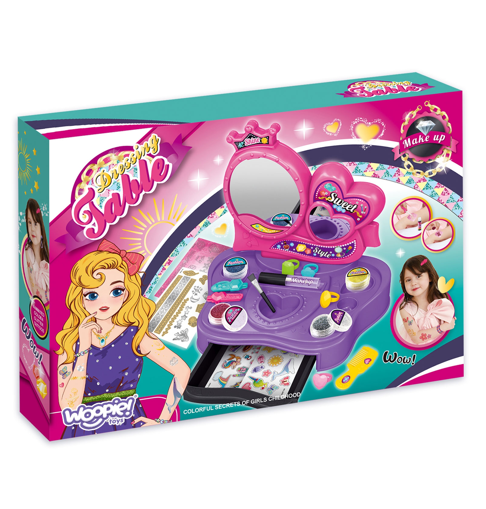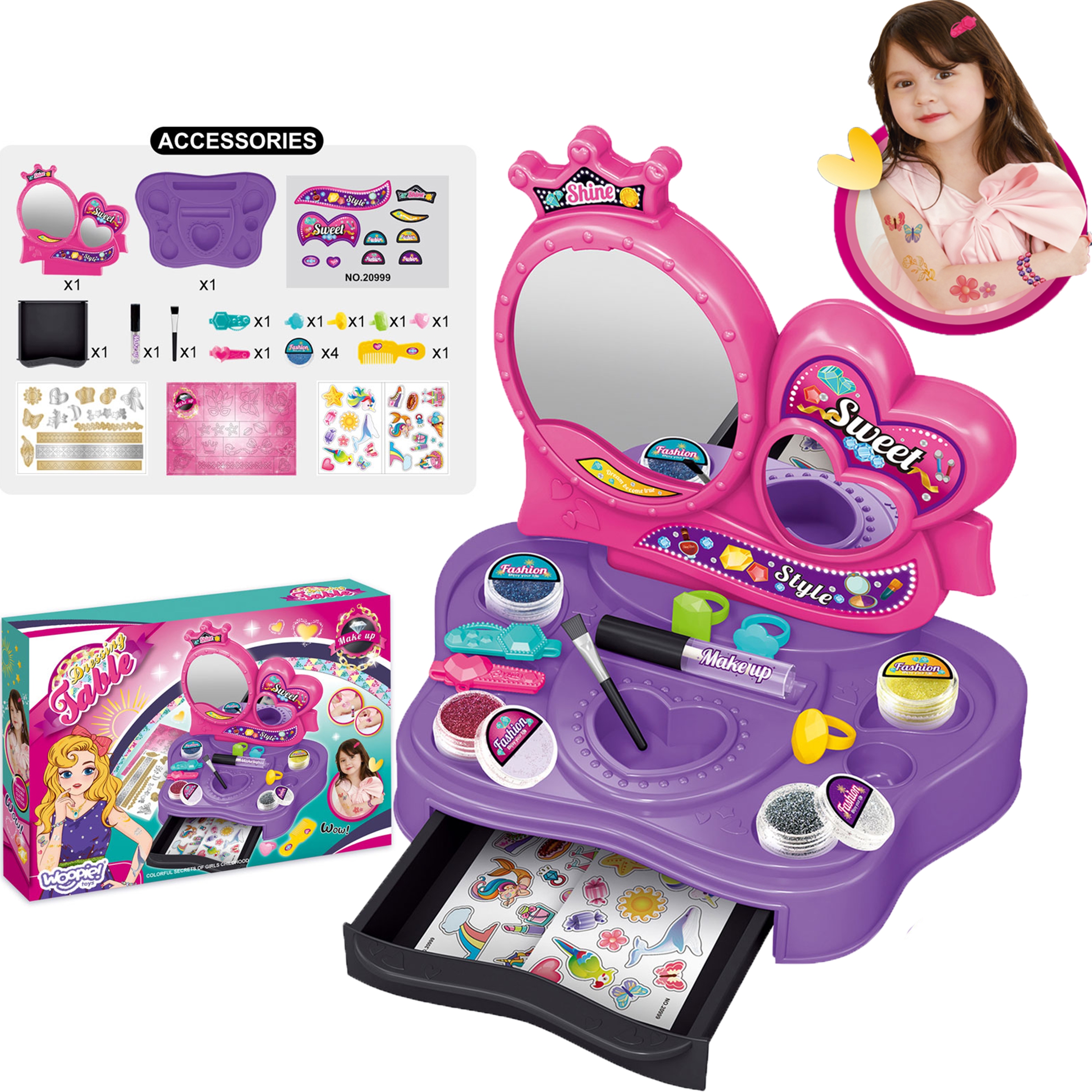 WOOPIE prekės ženklo kosmetinis staliukas „Makiažo studija 2in1“ – tai puikus rinkinys mažosioms mados mylėtojoms, kuris leis joms pasinerti į grožio pasaulį ir susikurti savo stilių! Žaislas atkartoja tikro grožio salono aplinką, kur vaikai gali eksperimentuoti su lipdukais, blizgučiais ir įvairiais aksesuarais. Rinkinys yra visiškai saugus, netoksiškas ir puikiai tinka vaikams nuo 3 metų. Jis lavina smulkiąją motoriką, kūrybiškumą ir vaizduotę, kartu padėdamas vaikui ugdyti pasitikėjimą savimi.