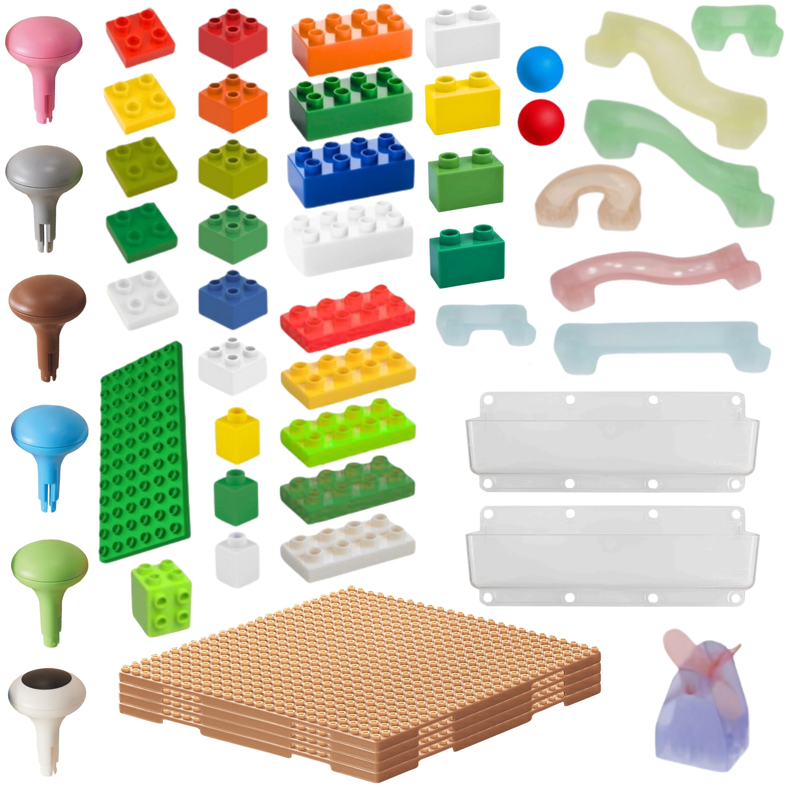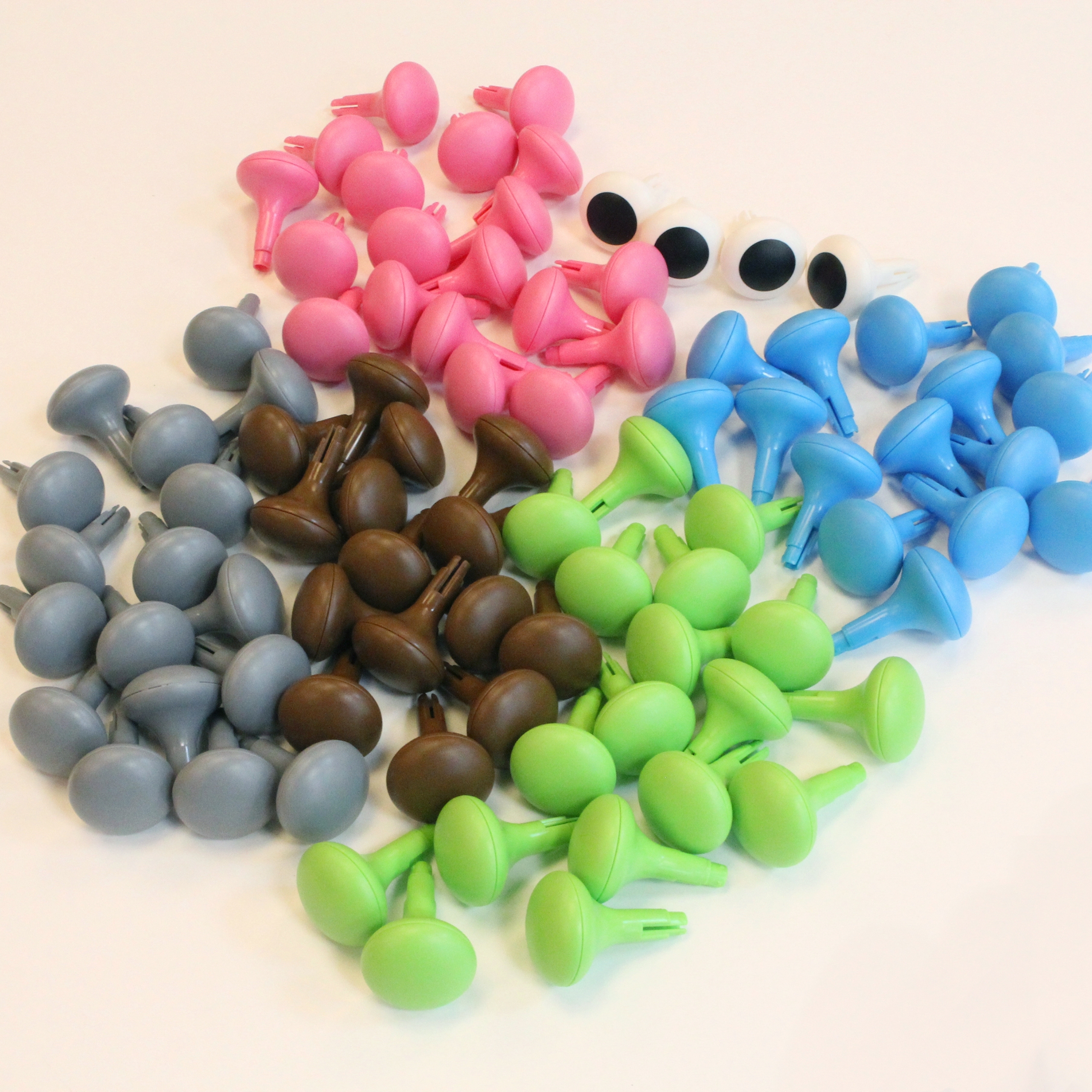 - 64 dideli spalvoti kaiščiai (Jumbo): po 12 vnt. penkių skirtingų spalvų ir 4 specialūs kaiščiai, primenantys akis.