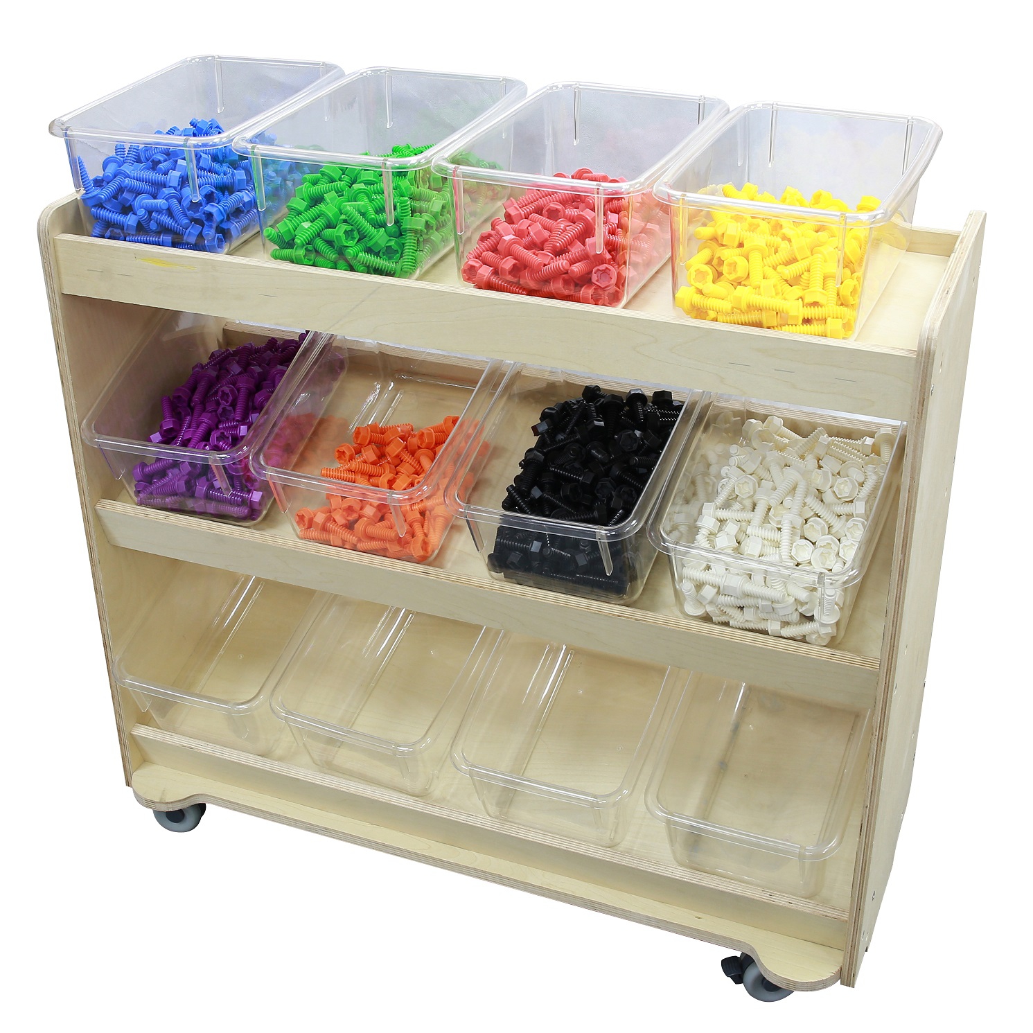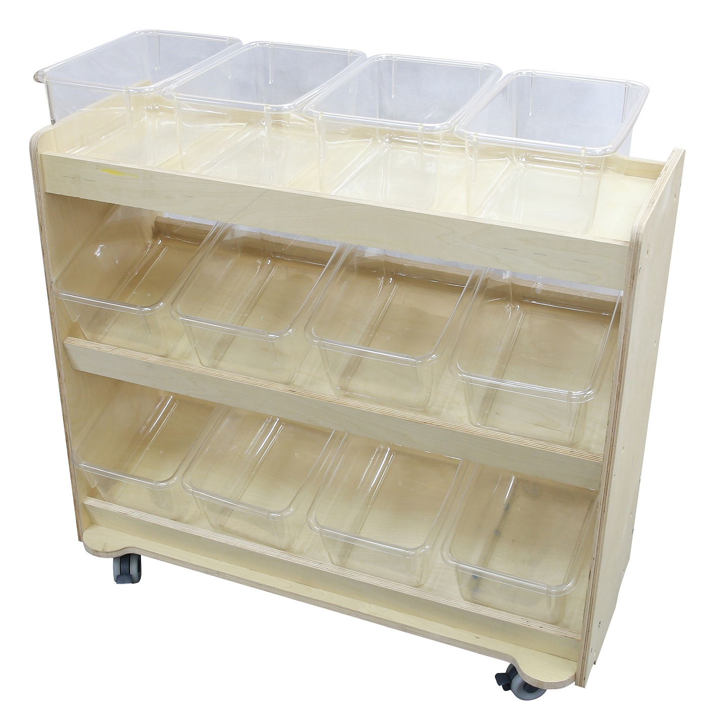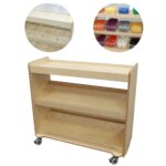 Specialiai suprojektuotos lentynos padeda palaikyti tvarką ir užtikrina, kad visi daiktai būtų lengvai pasiekiami vaikams. Didelis privalumas yra įmontuoti ratukai, kurie suteikia baldui mobilumo – jį lengva perstumti ir pritaikyti bet kokioje erdvėje pagal poreikį.
