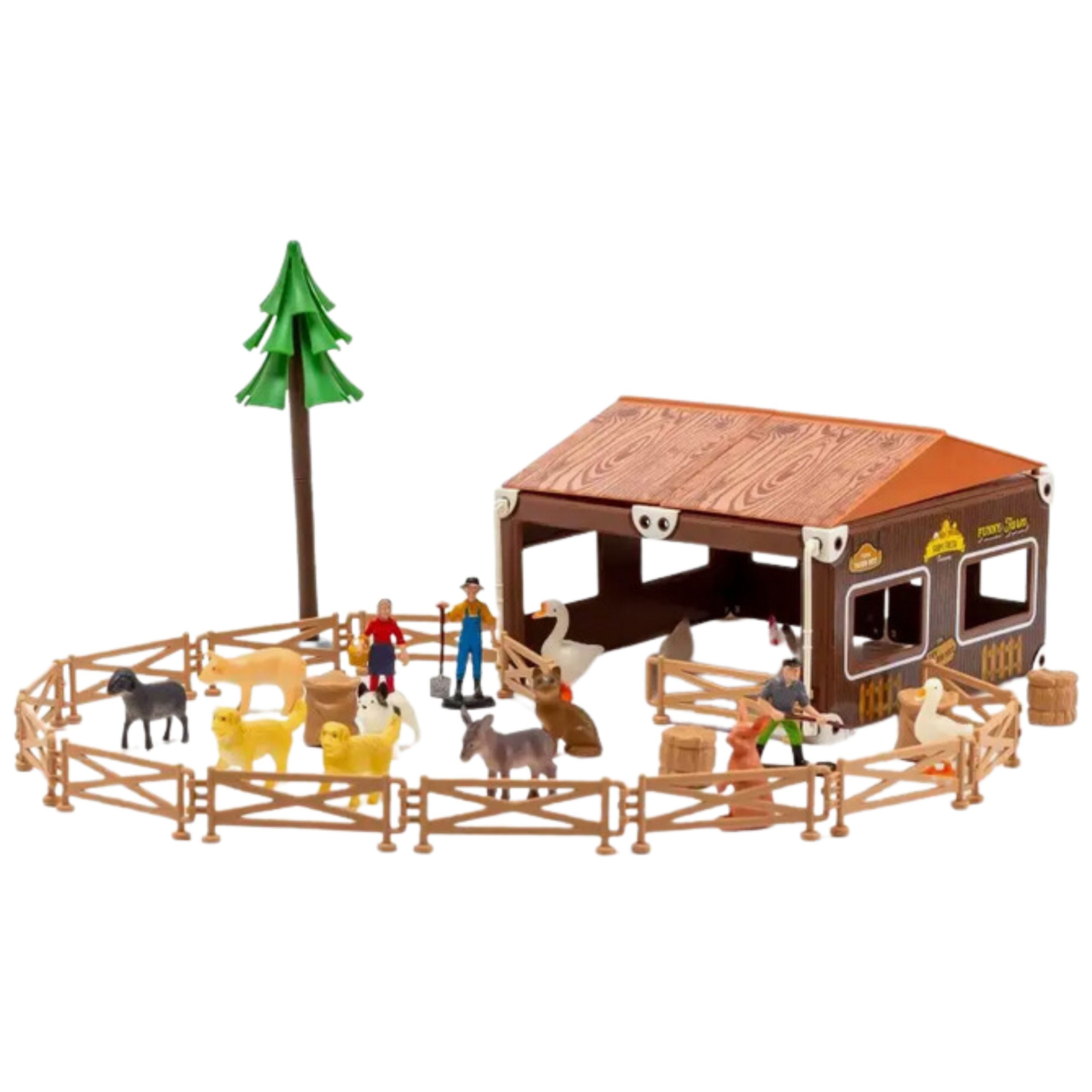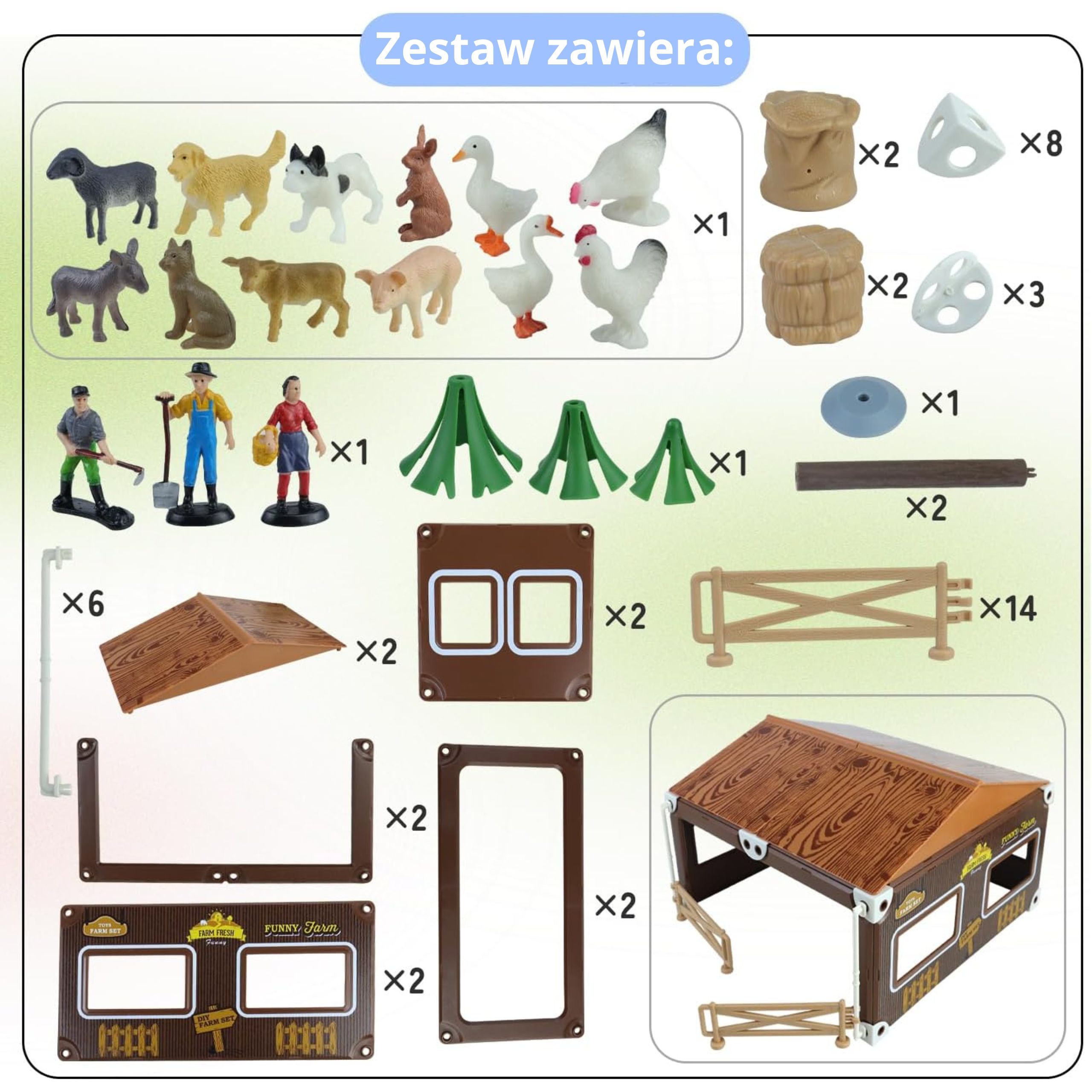 - Elementai: 65 elementai, įskaitant gyvūnų figūrėles, žmonių figūrėles, tvorą ir kitus ūkio elementus.