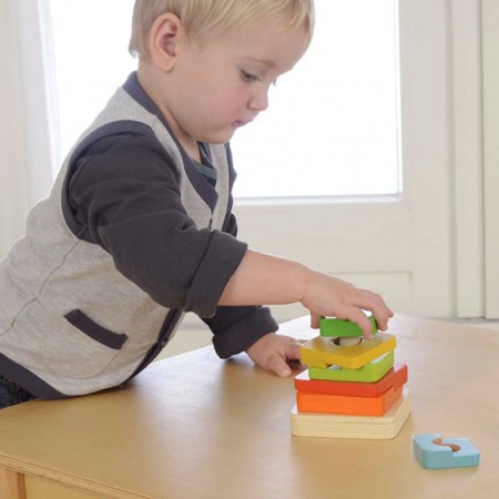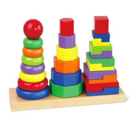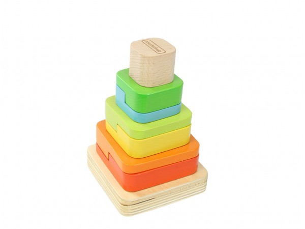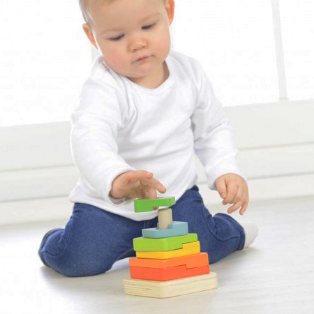 - 8 skirtingi elementai: Vaikai gali sudėlioti piramidę iš 8 skirtingo dydžio ir spalvų elementų, lavindami gebėjimą atpažinti formas ir spalvas.