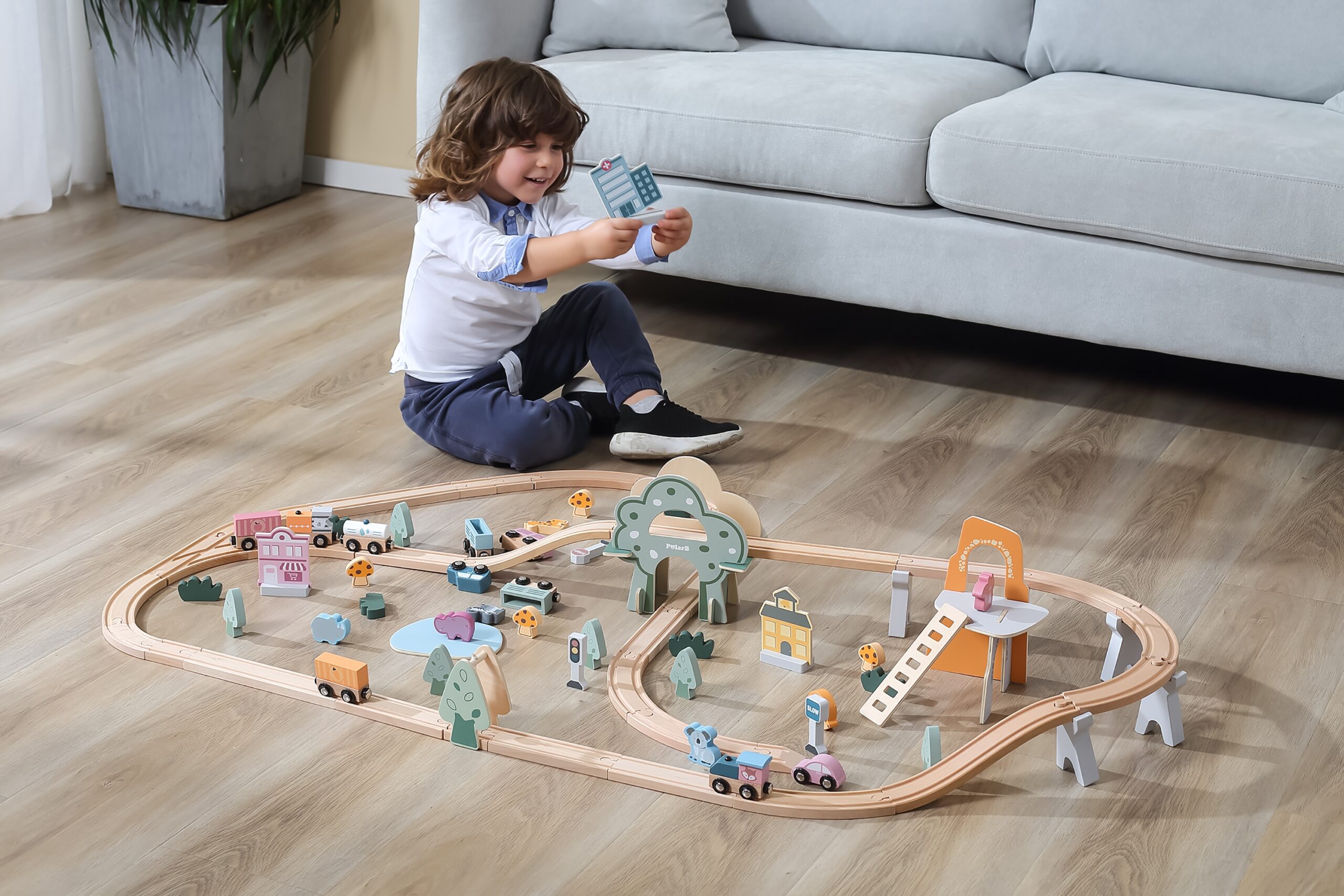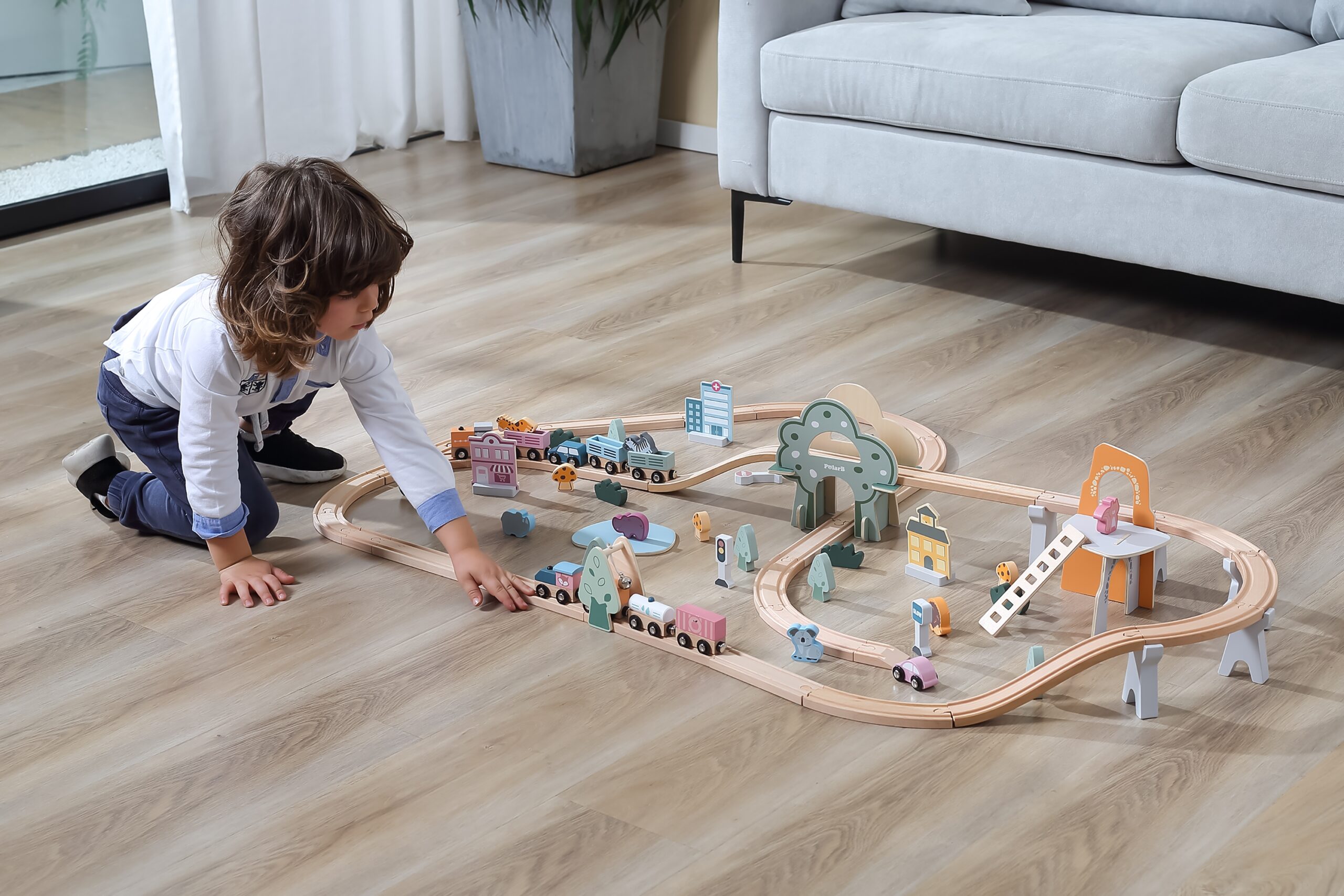 • 90 elementų rinkinys, kuriame yra bėgiai, pakilimai, traukinys su vagonais, geležinkelio ženklai, pastatai, gyvūnai, transporto priemonės, medžiai ir akmenys.
