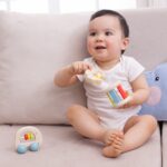 • Motoriniai įgūdžiai: Skatina smulkiąją motoriką, kai vaikas sugriebia, purto arba ridena žaislą.