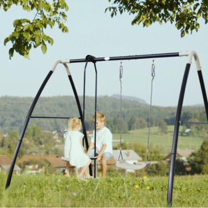 - Spalva: Pilka spalva suteikia sūpynėms modernią ir universalią išvaizdą, kuri dera prie bet kurio sodo ar kiemo dizaino.
