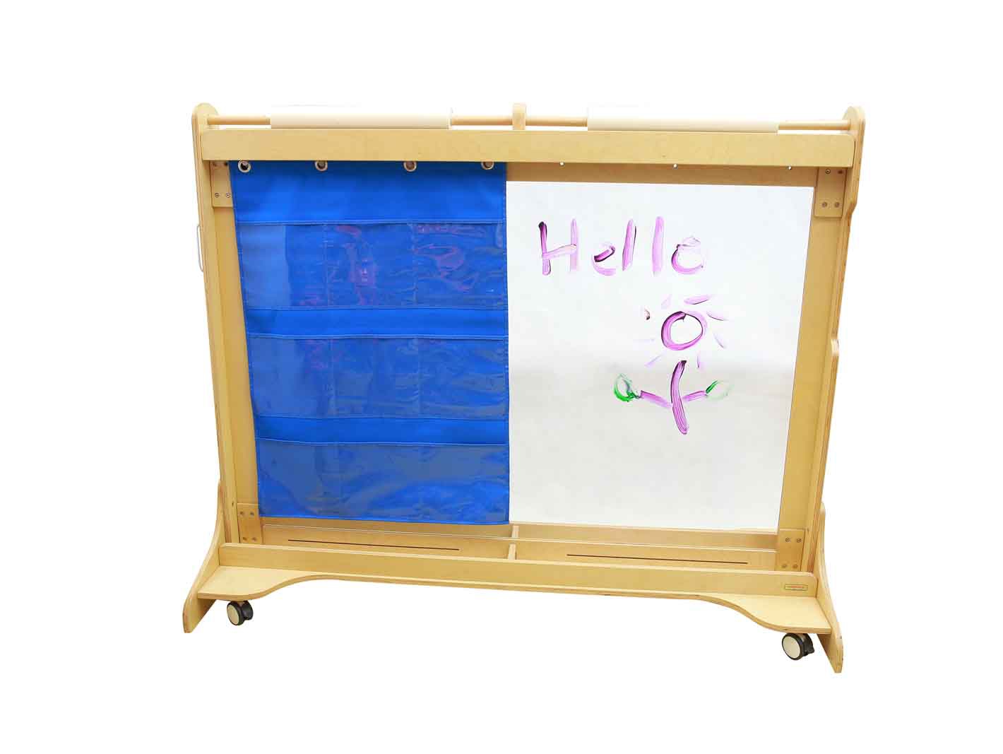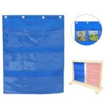 Dvipusis dizainas: Gaminys yra dvipusis – viena pusė turi tris eilutes patogių medžiaginių kišenėlių, o kita padengta specialia lipnia medžiaga (velcro), prie kurios puikiai kimba lipukai. Ši universali ypatybė leidžia naudoti laikiklį įvairiems žaidimams ir mokomajai veiklai – tiesiog paruoškite priemones su lipukais.