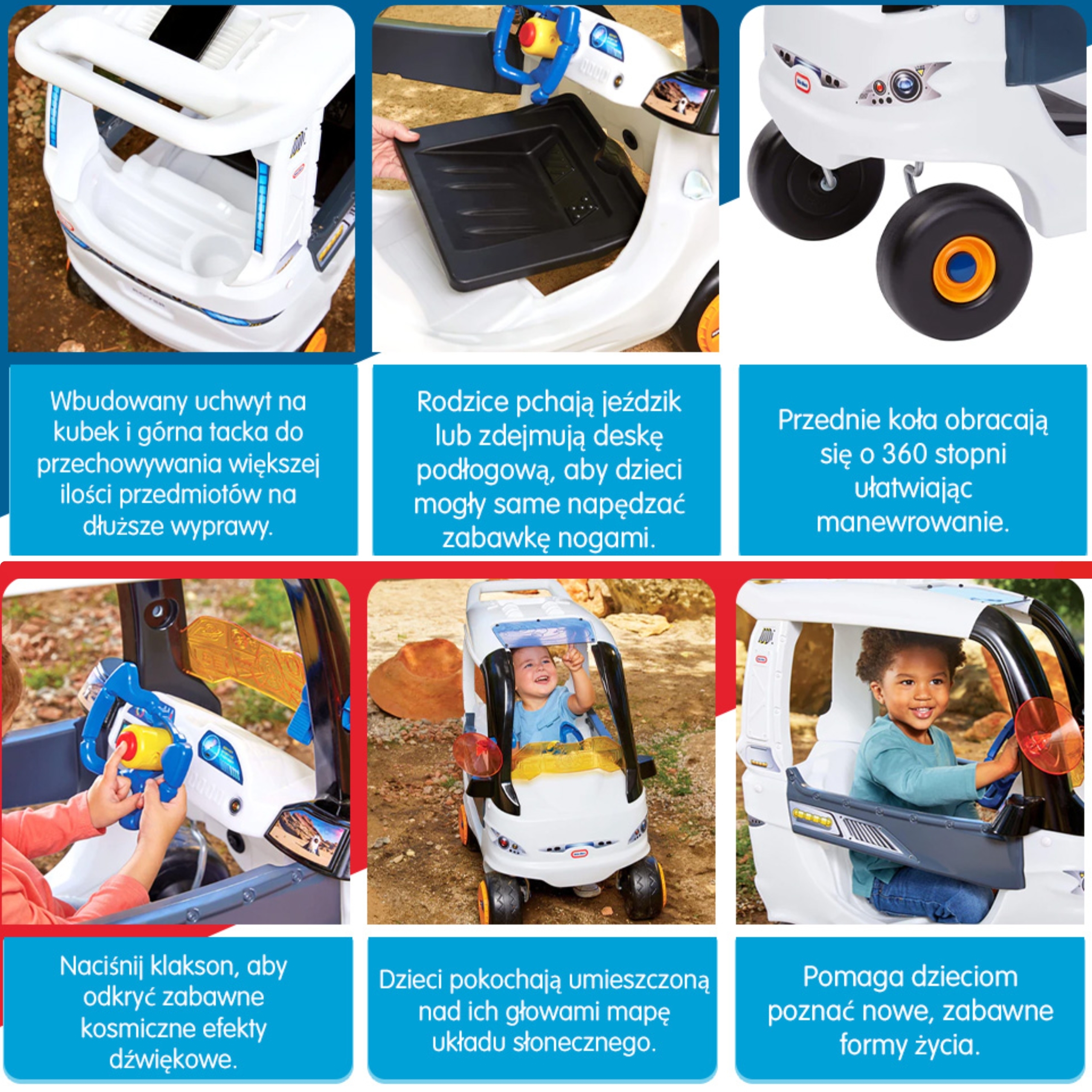 Pasiruoškite nepamirštamiems tarpgalaktiniams nuotykiams! Legendinis Little Tikes paspirtukas Cozy Coupe sugrįžta kosminio visureigio pavidalu, kad pakviestų jūsų vaiką į jaudinantį vaizduotės, aktyvių žaidimų ir pirmųjų kelionių pasaulį. Ši mašinėlė puikiai tinka smagiems pasivažinėjimams tiek namuose, tiek sodo takeliais. Ji sukurta atsižvelgiant į mažylių nuo 18 mėnesių amžiaus poreikius, užtikrinant saugumą ir begalinį džiaugsmą.