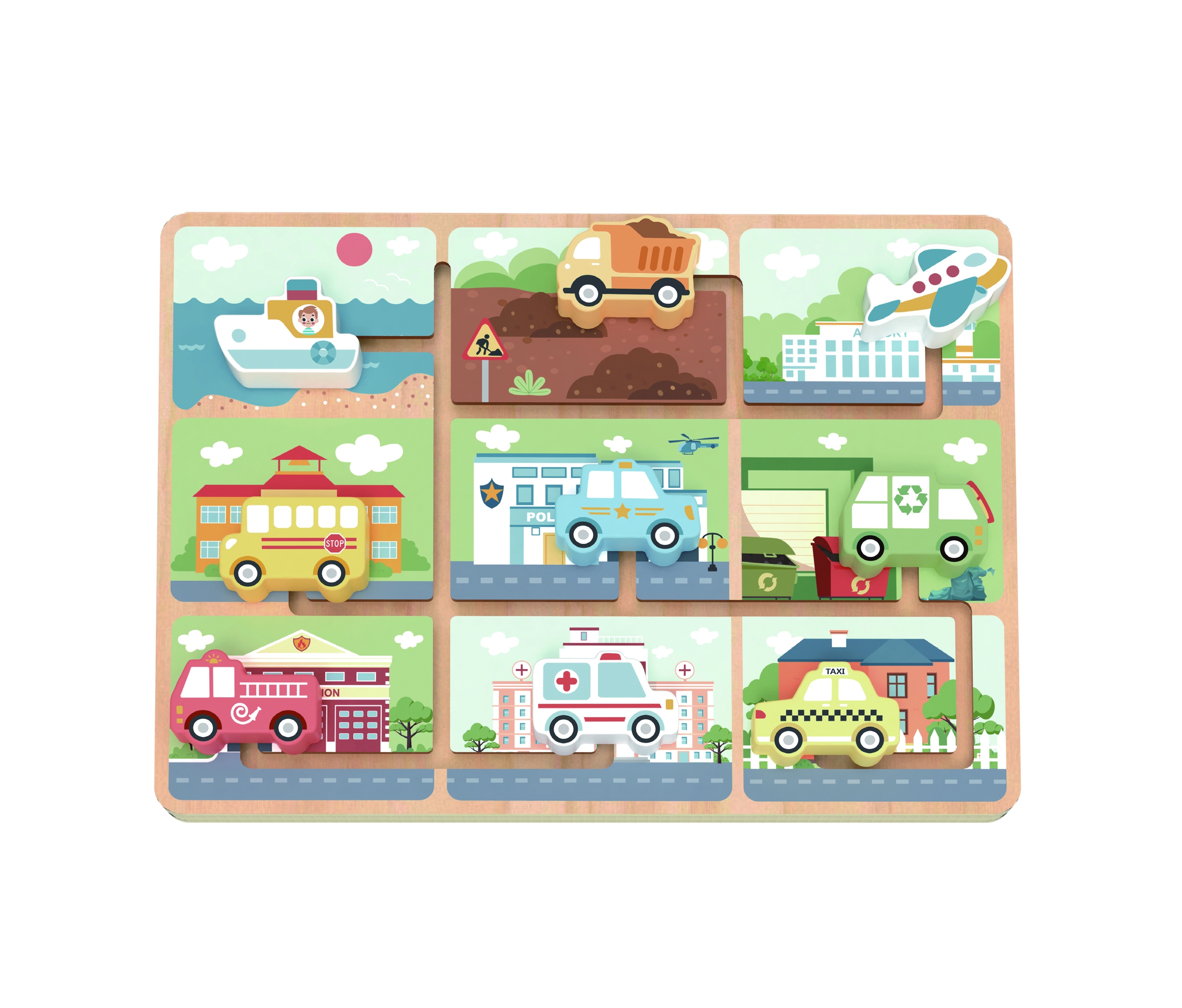 - Susipažįsta su transporto priemonėmis: Vaikai sužino, kur paprastai stovi tokios transporto priemonės kaip policija, greitoji pagalba, lėktuvas, laivas ir mokyklinis autobusas.