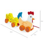 Šis žavingas vištos su dviem jaunikliais traukiamas žaislas sujungtas raudona styga, o tarp mažų paukščių įkomponuoti spalvingi karoliukai, kurie prideda papildomos žaismingos dinamikos. Kai vaikas traukia žaislą, visa grupė smagiai juda kartu, suteikdama linksmą ir interaktyvų patyrimą.