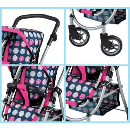 - Realistiškas dizainas: Gili lovelė, stogelis nuo saulės ir taškuotas medžiaginis užvalkalas suteikia vežimėliui tikroviškumo ir patrauklumo.