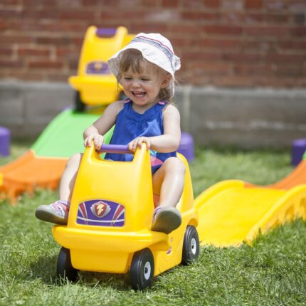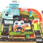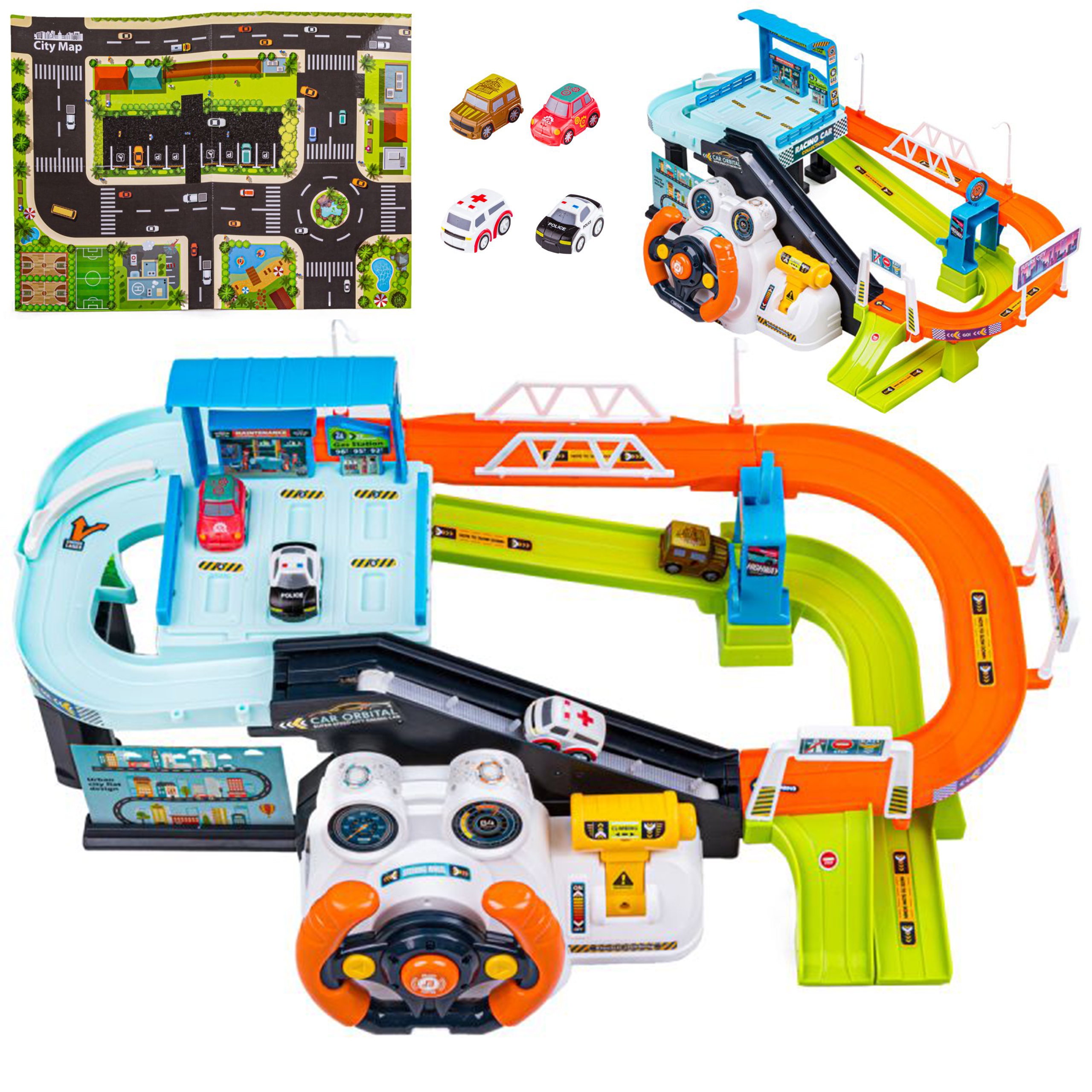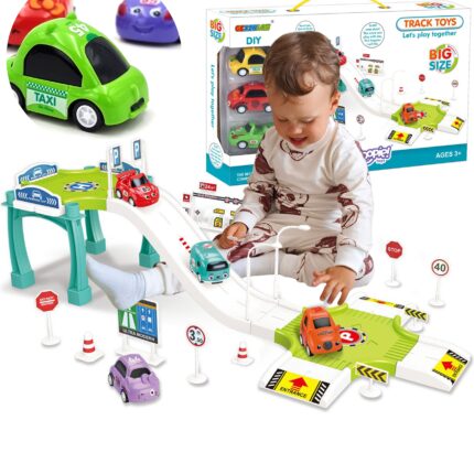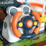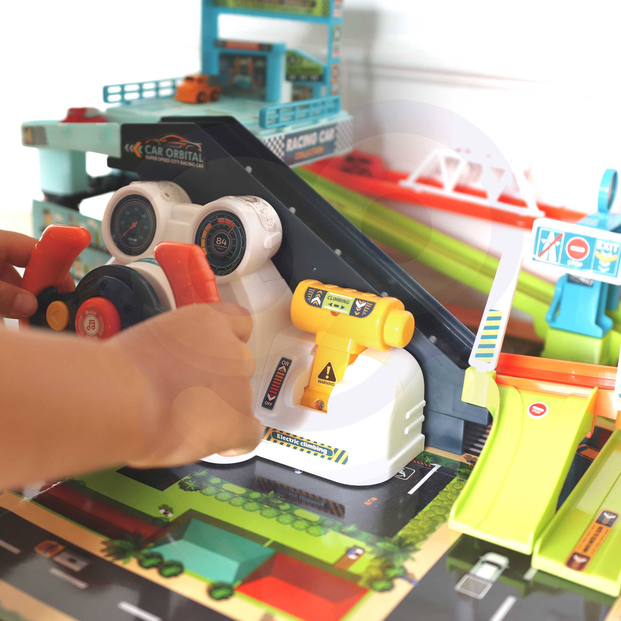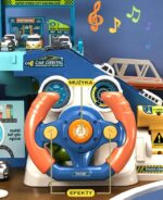 Parking Garaż z Kierownicą od firmy WOOPIE to idealny pomysł na prezent dla małego fascynata pojazdów oraz torów wyścigowych. Twój maluch będzie mógł zaparkować swoje autka w garażu wjeżdżając i zjeżdżając po kolorowych autostradach. Zestaw zawiera interaktywną kierownicę wydającą dźwięki, co uczyni zabawę jeszcze ciekawszą. Windę można uruchomić manualnie przekręcając wajchę dołączonego kołowrotka lub zamienić i podłączyć kierownice, wtedy winda działa automatycznie poprzez naciągnięcie wajchy z prawej strony kierownicy. W czasie jazdy można, również zmienić tor jazdy oraz zamknąć szlaban i zatrzymać auta. Na końcu samochody wyjeżdżają z parkingu wprost na matę dołączoną do zestawu. Zestaw zapewnia wiele godzin zabawy!