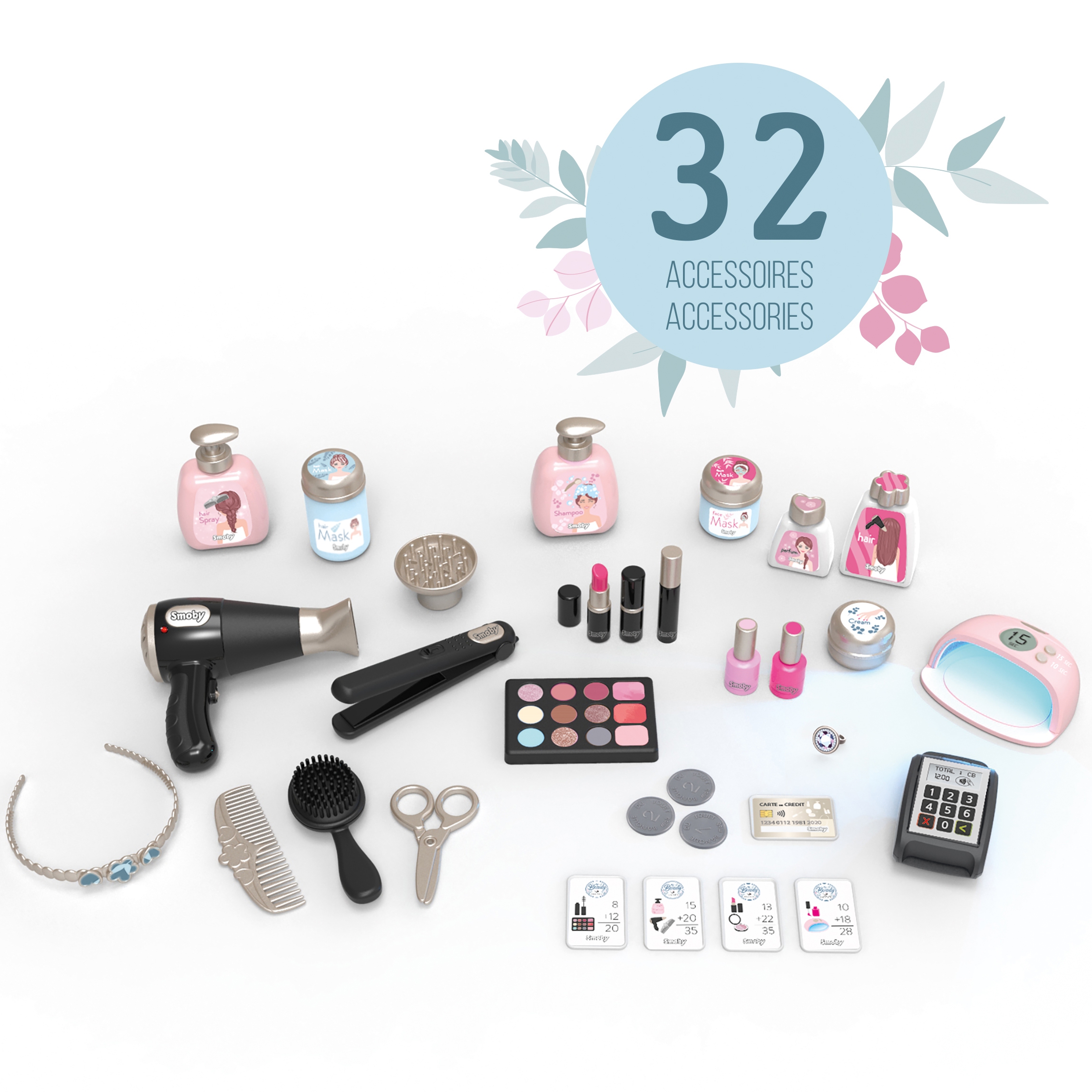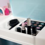- Daug priedų: Rinkinyje yra 32 aksesuarai, imituojantys tikrą kosmetiką, tokius kaip plaukų džiovintuvas, plaukų tiesintuvas, žirklės, nagų lakai, akių šešėliai, tušas ir lūpų blizgis.