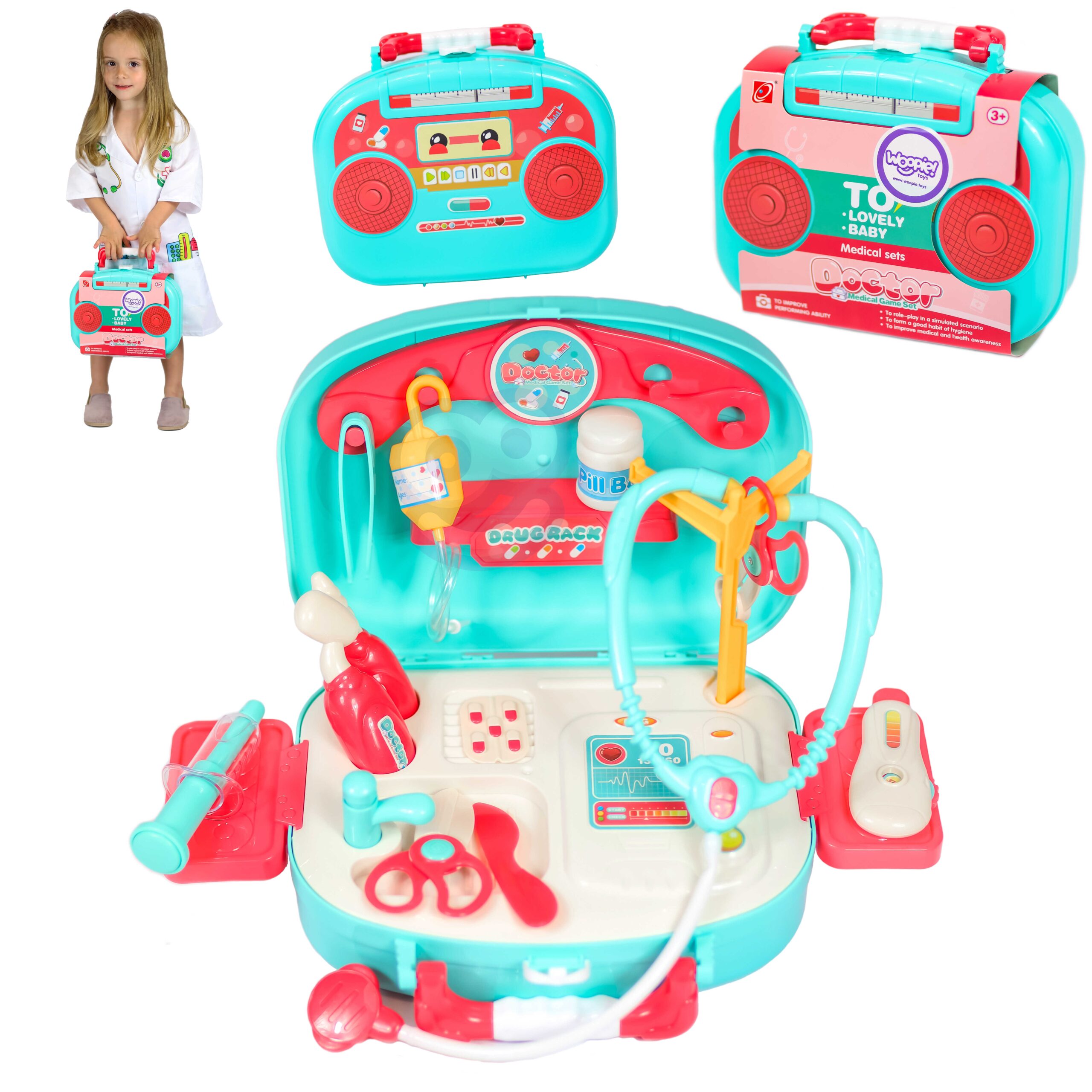 „Little Doctor Set“ iš Woopie yra kiekvieno mažo vaiko svajonė, suteikianti galimybę išbandyti gydytojo vaidmenį ir rūpintis savo „pacientais“. Šis rinkinys leidžia vaikams tapti mažais gydytojais, rūpintis savo iškamšomis ir lavinti socialinius bei integracijos įgūdžius per vaidmenų žaidimus.