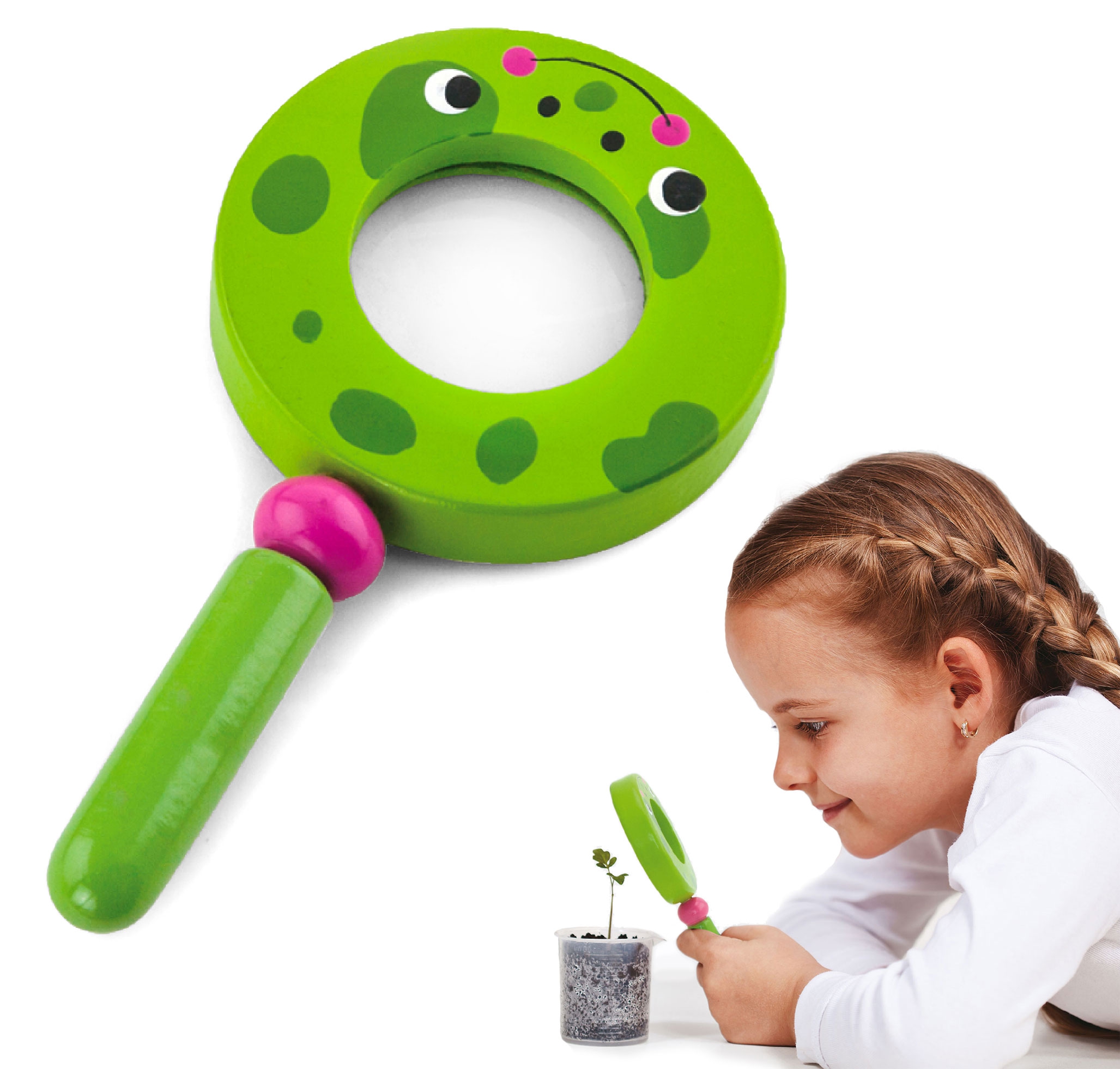 - Aukštos kokybės medžiagos: Didinamasis stiklas pagamintas iš buko medienos ir nudažytas netoksiškais dažais ryškiomis spalvomis, pritraukiančiomis vaiko dėmesį ir skatinančiomis žaidimą.